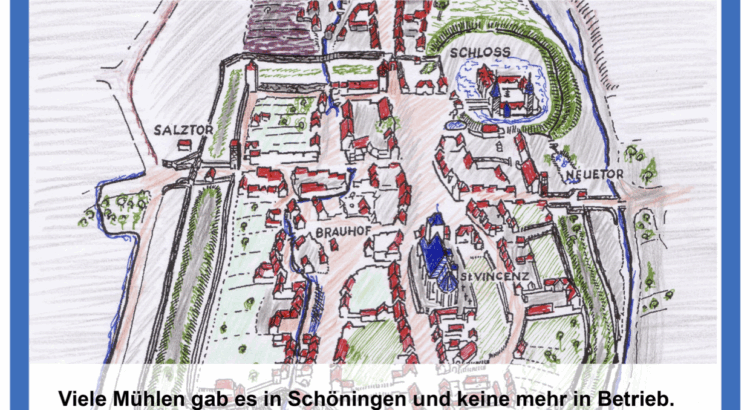 Wir möchten mit der Ausstellung an die zahlreichen Schöningen Wassermühlen erinnern, die vom Mühlenbach angetrieben wurden. Der Bach entspringt heute noch im Garten des Klostergutes. Er ist leider komplett verroht. So ist sein Verlauf heute nicht mehr zu erkennen. Der künstlich angelegte Wasserlauf auf dem Burgplatz entspricht nicht dem Verlauf des Mühlenbaches.