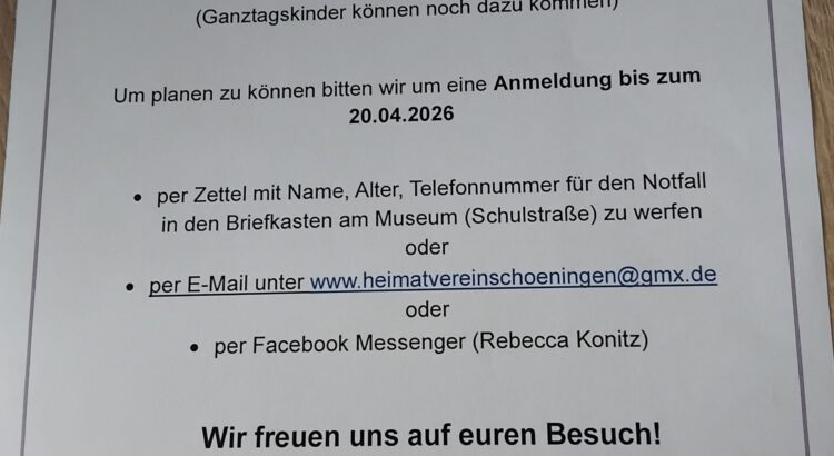 Um planen zu können bitten wir um eine Anmeldung bis zum 20.04.2026